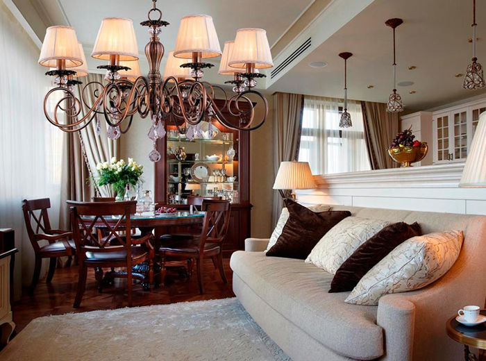 The main feature of the style is the most open space, which is achieved by combining several rooms and removing.